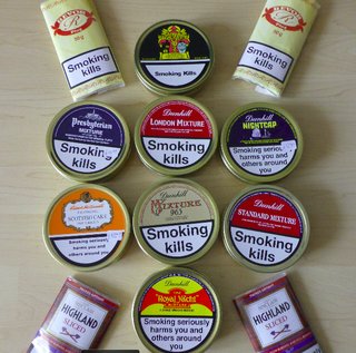 Skóciában jártam, a mellékelt képen látható amit magammal hoztam. Összességében megállapítom, hogy a skótok messze nem pipás nép, egy darab pipázó embert nem láttam, pedig szerteszét voltam több helyen is az országban. Gondolom egyrészt a nemrég bevezetett törvények, másrészt az időjárás miatt. A fővároson és a nagyobb városokon kívül gyakorlatilag csak a Condor és a St. Bruno pipadohányokat kapni, azt viszont szinte mindenhol, ahol cigit. A Dunhill, Ashton, Peterson választék ha nem is teljes, de széles, volt egy-két Samuel Gawith, és úgy nagyjából ennyi. Edinburgh-ban 2 dohányboltban jártam, az egyik a Royal Mile vár felőli részén, az út kb 1/3-ánál, a másik innen kb. 15 perc séta, a Rose Streeten, annak is a végén volt. A Rose Street-i az egy komolyabb dohánybolt. A Leith Walk-i boltban nem jártam. Szivarokból is elég nagy választék volt. A pipadohány egyáltalán nem olcsóbb az itthoni árakhoz képest, sőt. |