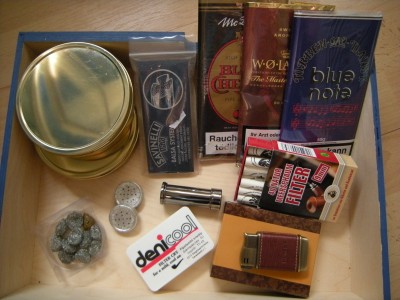 Új gunmetal pipatöltő, bontatlan 15 darabos Savinelli balsaszűrő, 3 híján 40 darabos tajtékkő-szűrő, 12 grammos Denicool kristály kb. fele, 2 dohánynedvesítő kapszula, meg egy kupac fémrostélygolyó a kazán aljára, 1 újszerű antikolt és bőrbevonatos gázos pipagyújtó....