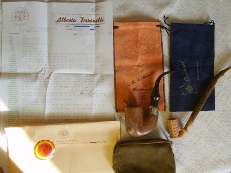 Amellett, hogy egy gyönyörű közel 60 éves múzeumi Paronellit kaptam, névre szóló levelet mellékelt mellé, amit az öreg maga gépelt. Küldött grátisz egy 1950-ben készül kóstoló agyagpipát szintén saját tasakjába és egy 1970-ben készült zippzáros velúr dohánytartó tasakot is. Mellékelt egy csomó régi írásáról fénymásolatot, mely a pipázásról és a Paronelli történetéről szól s azokat is szignózta. Személyesen adta fel a postán és 3 különböző méretű dobozkába párnázta be, hogy nehogy megsérüljön. Régi vágású úriember a mester, hangsúlyozom ÚRIEMBER! - Jajj, most nagyon boldog vagyok. Már be is tömtem piros Amphorával, mert egyre megkért, hogy használjam. Nem egy múzeumnak készítette s azért adta el halála előtt, hogy örömet okozzon vele egy igazi pipásnak. -Ariberto bácsi, ígérem nagyon megbecsülöm és vigyázni fogok rá!-