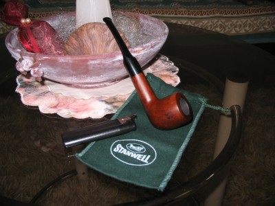 Jajjj, nem tudtam tovább várni és délelőtt átugrottam Kecskemétre, ahol Derek barátom segédletével megvettem ezt a TOSCANA pipát. Mindössze 3800 Ft volt és kaptam mellé grátisz még egy szép Stanwell zacsit, meg egy pipa öngyújtót. (Valószínűleg ezeket is Derek-nek köszönhetően. :-)) Szóval szerintem jó vásárt csináltam, boldog vagyok. :-) Egyelőre azonban még nem használom új szerzeményemet, mert derek ajándékozott nekem egy fekete, bent típusú pipát és azon ízlelgetem a különböző dohányfajtákat, ill. tanulom a pipázás technikáját. Mindenesetre isten áldásának tartom ezt a 9mm-es szűrőt, az élmény most mennyei, össze sem lehet hasonlítani évekkel ezelőtti próbálkozásaimmal, amikor 20-30 éves pipákba beletömtem minden vackot, ami a kezembe akadt. :-) Szóval jó lesz ez, érzem. :-) A füst legyen veletek!