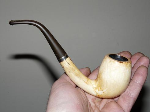 Eladó ez a nagy méretű,részben felújított tajtékpipa.Még régebben csere-beréltem Stgellért fórumtársunkkal,de rájöttem,hogy a tajték nem az én világom.A kazántér tökéletes,és a pipafej is,a száron van egy repedés,de ennek ellenére falsot nem szív,és az ezüstgyűrű megakadályozza a továbbterjedést is.Egy két jobb pipás boltban kapható tajtékporos ragasztóval tökéletesen orvosolható.